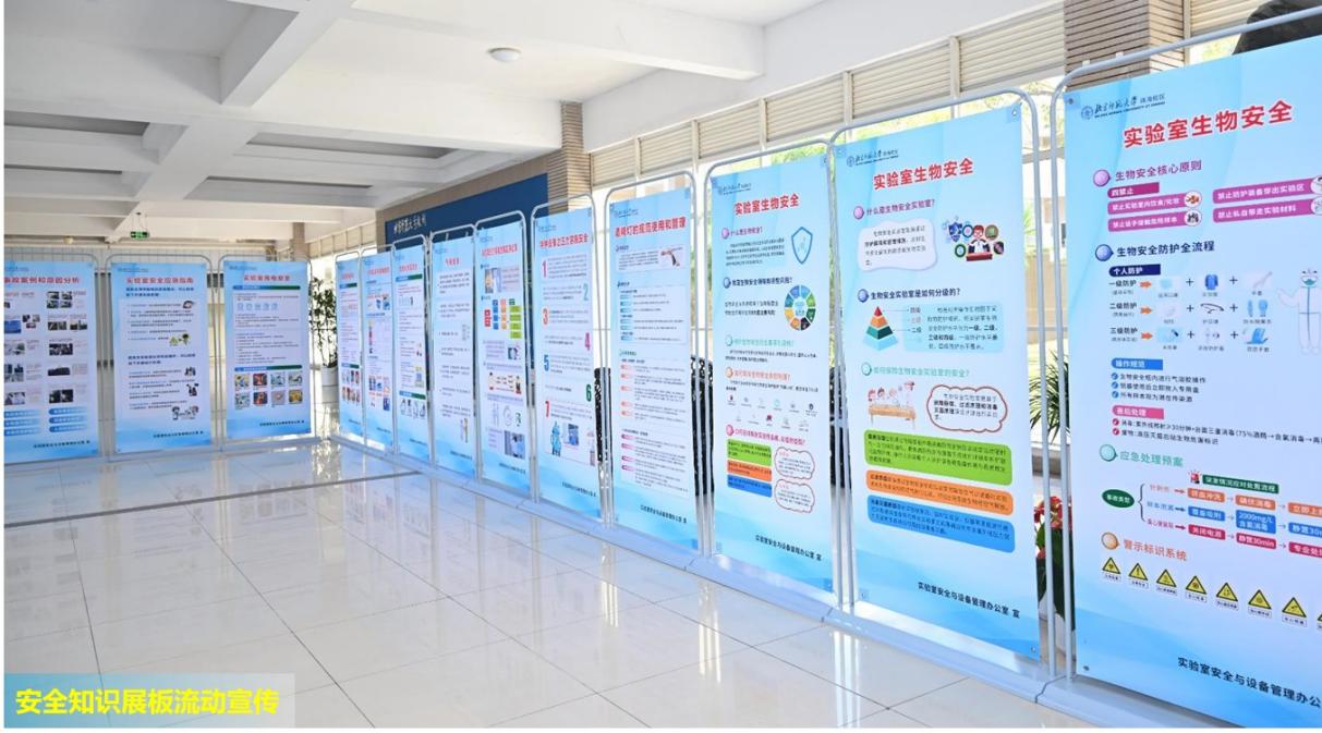 “实验室安全文化月”系列活动的收官环节是“实验室安全知识展板流动宣传”活动。活动精心设计了18块主题展板,内容涵盖实验室事故案例分析、化学安全、生物安全、机械安全、特种设备安全、用电安全、用气安全及酒精灯使用安全等核心板块,精准对接校区实验室安全保障实际需求与日常运维工作要点,全方位覆盖了实验室安全管理关键环节。目前,展板已在实验室集中的核心楼宇显著位置完成布设并开展流动展示。通过图文并茂的呈现形式,安全知识被直观生动地传递给师生,既紧密贴合师生日常实验操作场景,又强化了安全风险警示效果,持续扩大了安全文化宣传覆盖面。