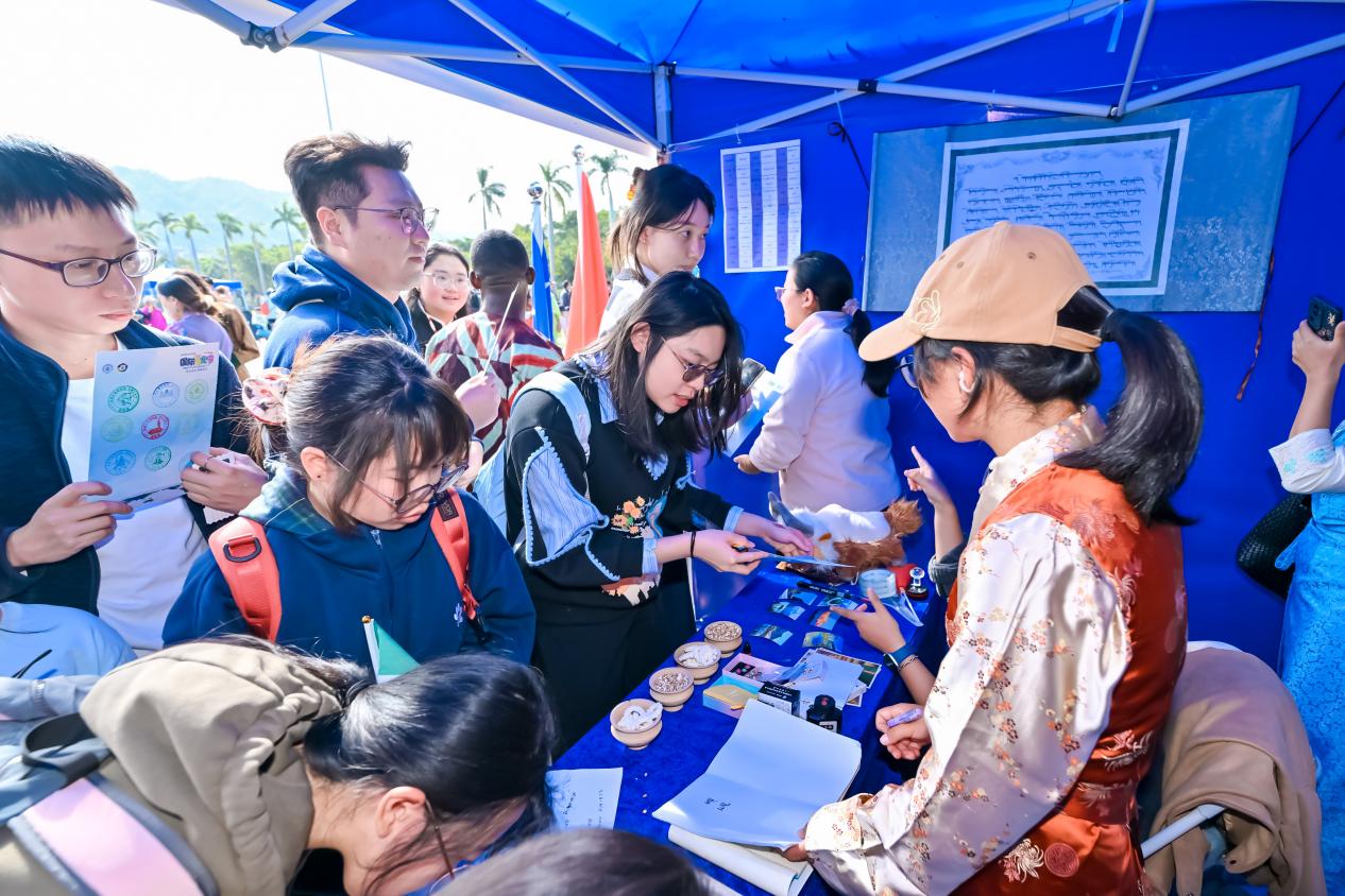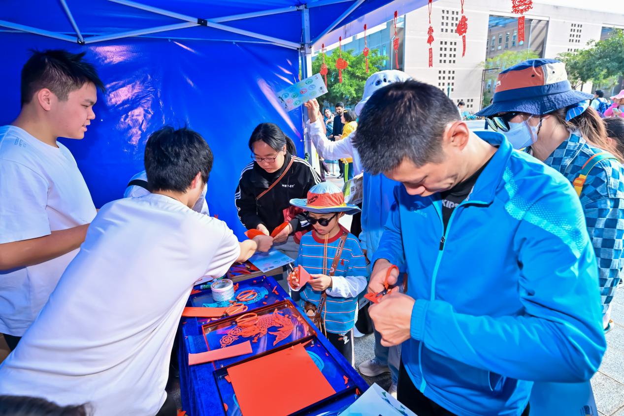 此外,由北京师范大学非物质文化遗产研究与发展中心联合乐育书院、会同书院、弘文书院、砺行书院四大书院共同打造的中华优秀传统文化主题摊位备受瞩目。剪纸、螺钿制作、中国结等非遗技艺沉浸式展示,藏文艺术与岭南风貌的特色呈现,让各国学生在亲身参与制作的过程中,领略中华美学的独特韵味与中华文化的深厚底蕴。