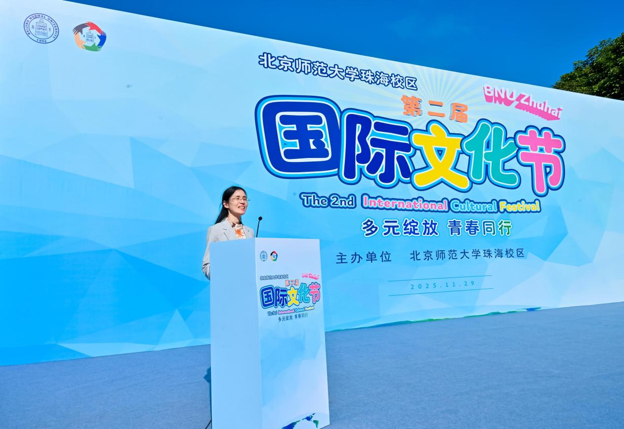 珠海校区国际交流与合作办公室主任郭侃俊致辞。她简要回顾了北京师范大学珠海校区近年来在国际化建设领域取得的丰硕成果,围绕“多元绽放 青春同行”主题深刻阐释活动内涵,着重强调青年是文明互鉴的核心载体与中坚力量,希望中外师生以本次国际文化节为契机,深化对多元文化的认知与包容,以青春之力搭建跨越国界的友谊纽带,同时积极推动中国文化走向世界、实现有效国际传播。