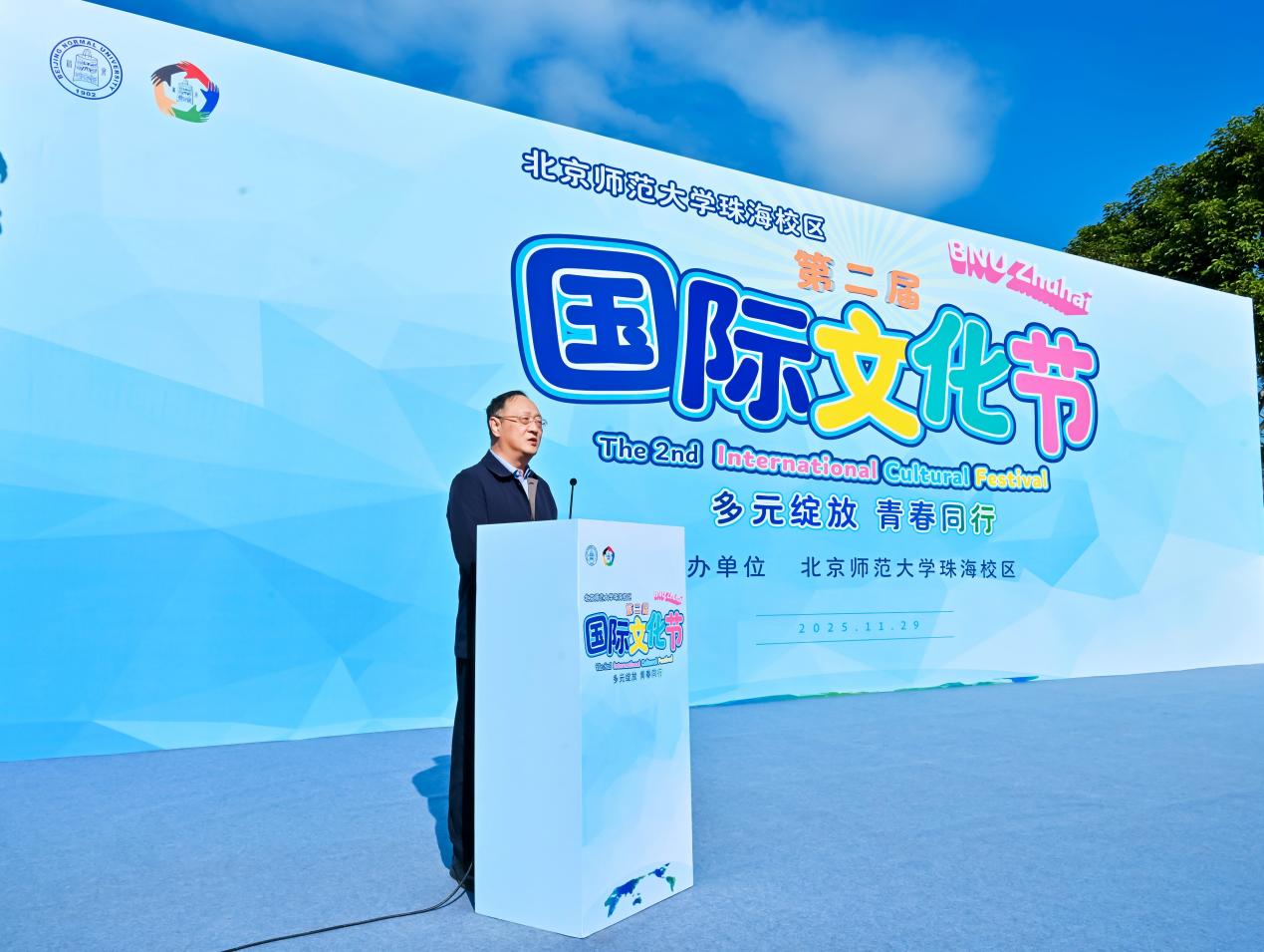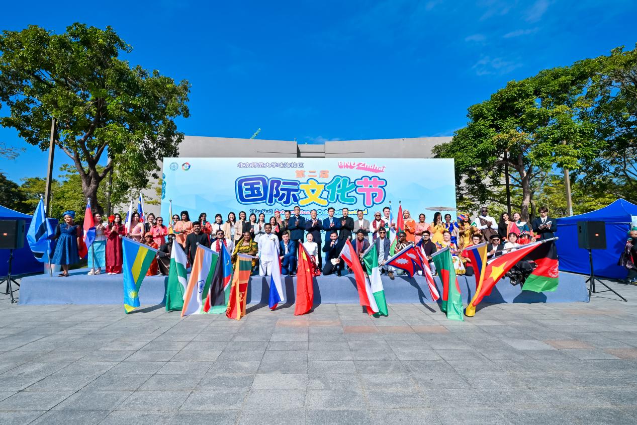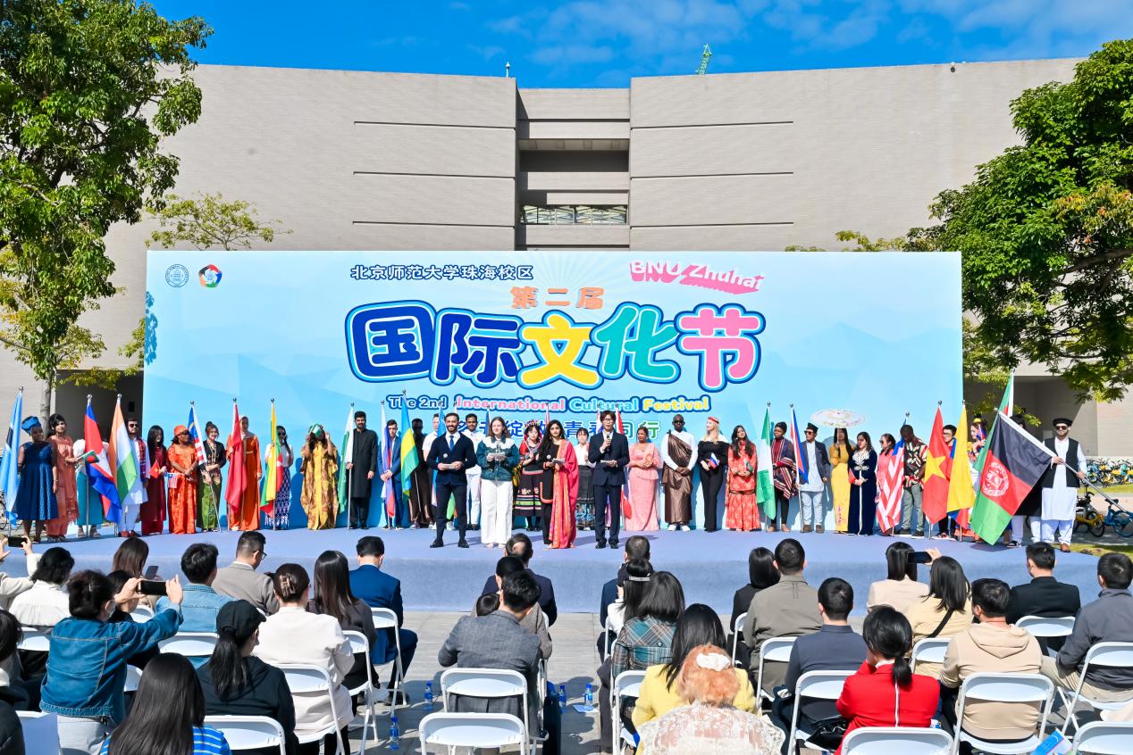 11月29日上午, 以“多元绽放 青春同行”为主题的北京师范大学珠海校区第二届国际文化节在图书馆前广场启幕。珠海市委外事工作委员会办公室、珠海市教育局、珠海市公安局、珠海市高新区文化服务中心、珠海市高新区移民事务服务中心等单位代表,北京理工大学(珠海)、北师香港浸会大学师生代表,珠海校区各学院、书院及职能部门负责人、外籍与港澳教师代表,以及北京师范大学珠海实验学校师生代表共同出席,见证活动开启。