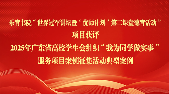 近日,在2025年广东省高校学生会组织“我为同学做实事”服务项目案例征集活动中,乐育书院“世界冠军讲坛暨‘优师计划’第二课堂德育活动”项目,凭借其创新模式、显著实效和广泛影响,在众多优秀项目中脱颖而出,获评思想引领类典型案例。此项殊荣是对乐育书院学生会扎根同学、务实服务的高度认可,也是北京师范大学“学院+书院”双院协同育人机制成效的一次生动彰显。