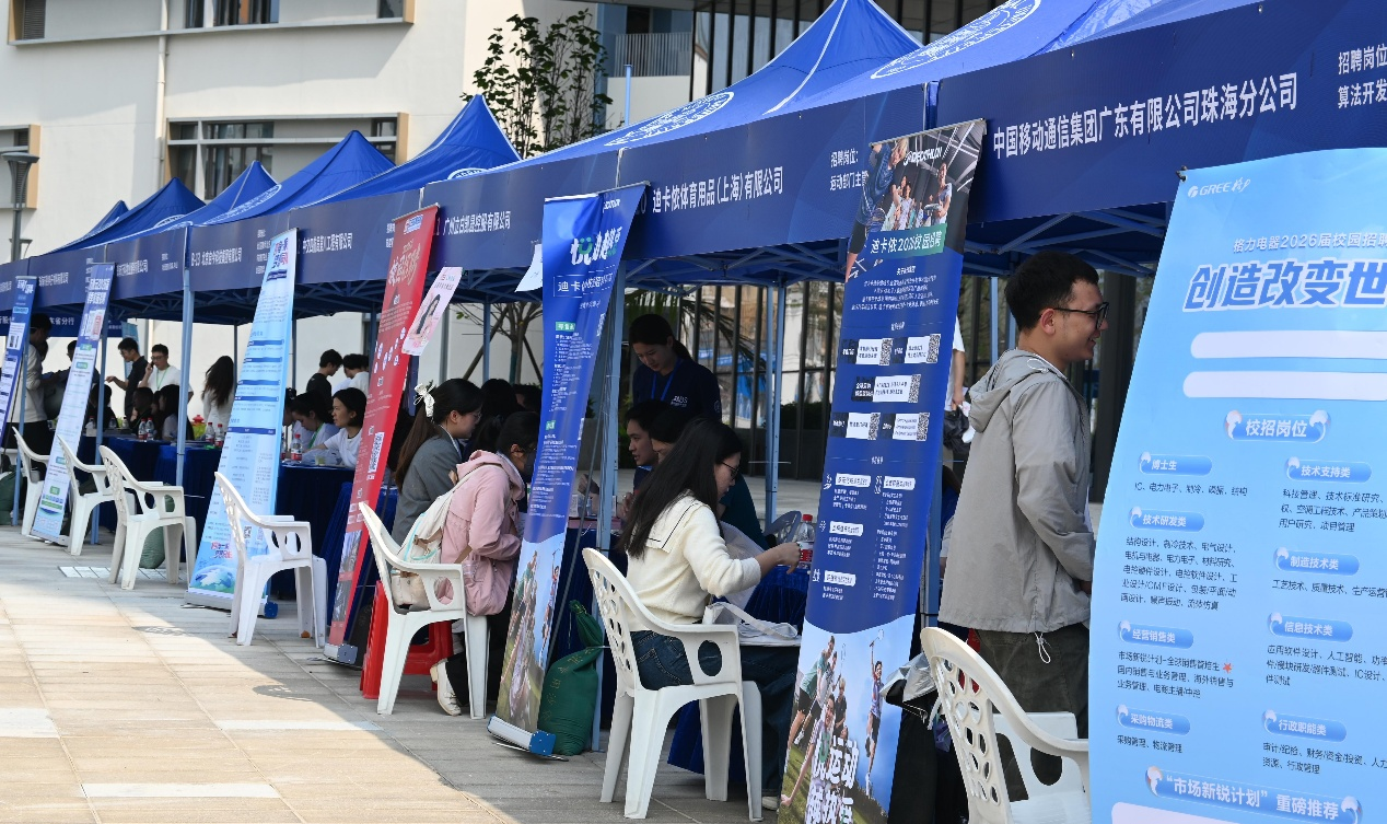 3月25日下午,北京师范大学珠海校区2026年春季学期经济管理类专场双选会在理工综合体西侧广场举办。本次活动由校区学生职业发展与就业指导中心主办,湾区国际商学院、会同书院、知行书院联合承办,共吸引36家来自金融、科技、制造、咨询等领域的36家知名企事业单位进校招聘,提供岗位790余个,为毕业生及在校生搭建了高质量的就业与实习对接平台。