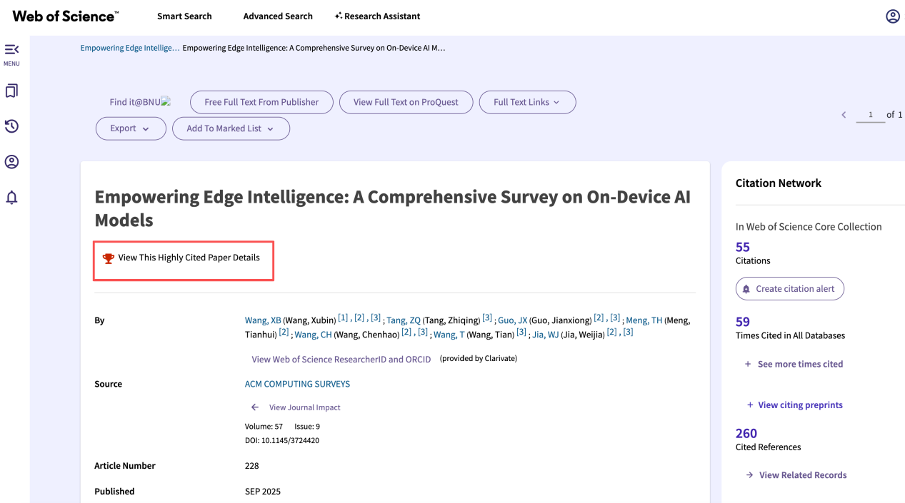 近日,AI与未来网络研究院贾维嘉教授团队在人工智能与边缘计算领域取得重要科研进展,其团队参与合作完成的论文“Empowering Edge Intelligence: A Comprehensive Survey on On-Device AI Models”发表于国际顶级综述期刊ACM Computing Surveys,并入选2026年第1期和第2期ESI高被引论文,标志着该研究成果在国际学术界产生了重要影响。