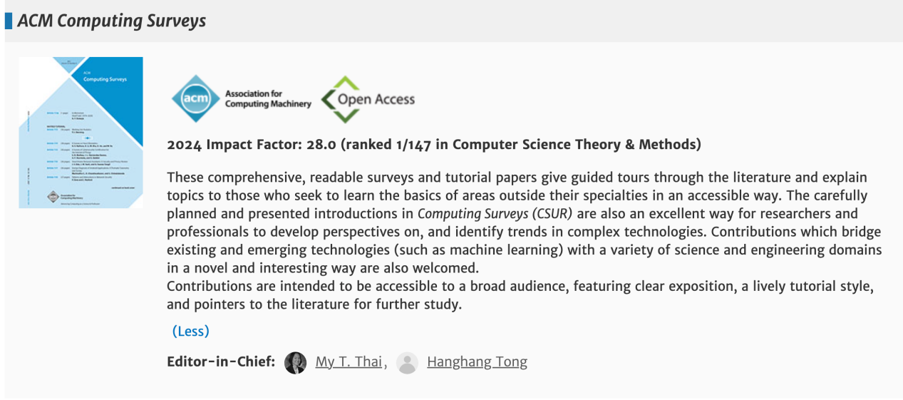 ACM Computing Surveys是国际计算机学会旗下旗舰综述类期刊,创刊于1969年,是计算机科学领域最具影响力的综述期刊之一。根据最新Journal Citation Reports 2024数据,该期刊影响因子为28.0,在Computer Science, Theory & Methods类别中排名第1位,体现出极高的学术影响力与国际认可度。