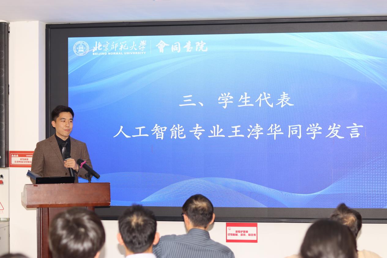 文理学院、会同书院2023级人工智能专业学生王浡华作为学生代表发言。他结合自己参加多项竞赛的经历,分享了自己从“单打独斗”到“融合创新”的心路历程,讲述了将人工智能算法应用于系统科学排名聚合课题等实践。他表示,在DeepSeek、Qwen等大模型席卷全球的当下,作为人工智能专业的学生,不仅要深耕算法的“深度”,更要拓展应用领域的“广度”,立志成为“AI+X”的架构师。他号召同学们主动拥抱变化,在知识的边界上携手拓荒,用交叉融合的智慧定义属于这一代人的创新坐标。