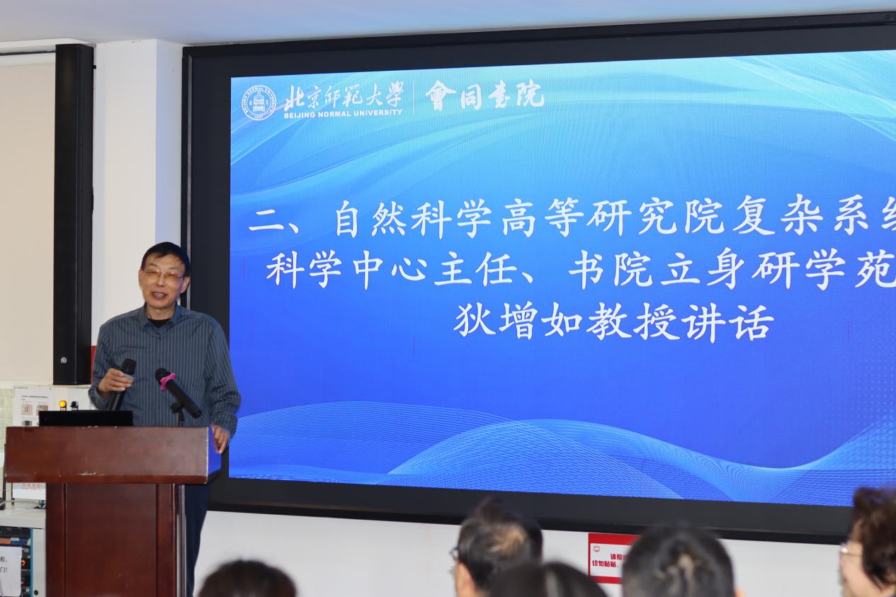 随后,狄增如教授发表讲话。他通过对“还原论”的具象化解释,结合复杂系统科学的研究实践,深入阐释了学科交叉融合的内在逻辑与时代价值。他指出,系统科学与现代科技经历了一个由“还原”走向“综合”的过程,当今世界面临的重大科学问题和社会挑战具有高度的复杂性和综合性,单一学科的视角和方法已难以有效应对。他强调,学科交叉融合不是简单的学科叠加,而是要通过深度的对话与协作,产生新的概念框架、研究方法和理论体系。他勉励同学们在学科交叉的道路上要做到以下四点:培养系统思维,学会从整体和关联的视角看待问题;保持开放心态,勇于接触和学习不同领域的知识;注重问题导向,以解决实际问题为出发点;做到格物致知,学会创造知识,为未来造福人类文明和民族复兴奠定坚实基础。