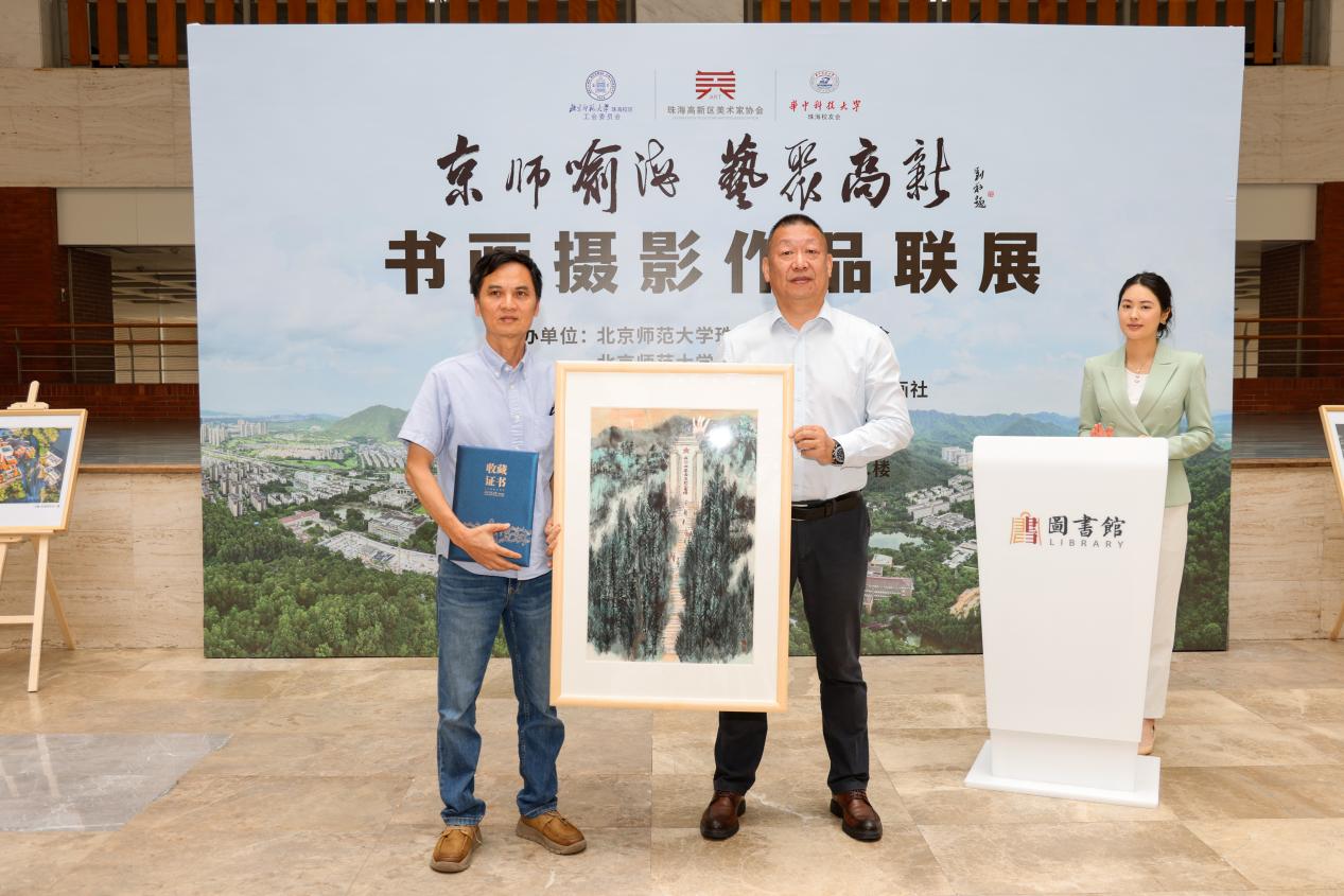 致辞结束后,现场举行了馆藏及展览作品赠送仪式。薛建庆代表珠海高新区美术家协会向北京师范大学珠海校区图书馆赠送作品,协会副主席左景武向北京师范大学珠海校友会赠送作品。随后,全体嘉宾合影并参观展览。