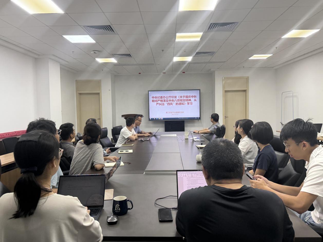 为深入贯彻中央八项规定精神学习教育,严防“四风”问题反弹,在国庆、中秋双节来临之际,9月29日,理工实验平台直属党支部书记傅勉兴主持召开“守廉洁,过两节”廉洁主题教育会议,理工实验平台全体人员参加。